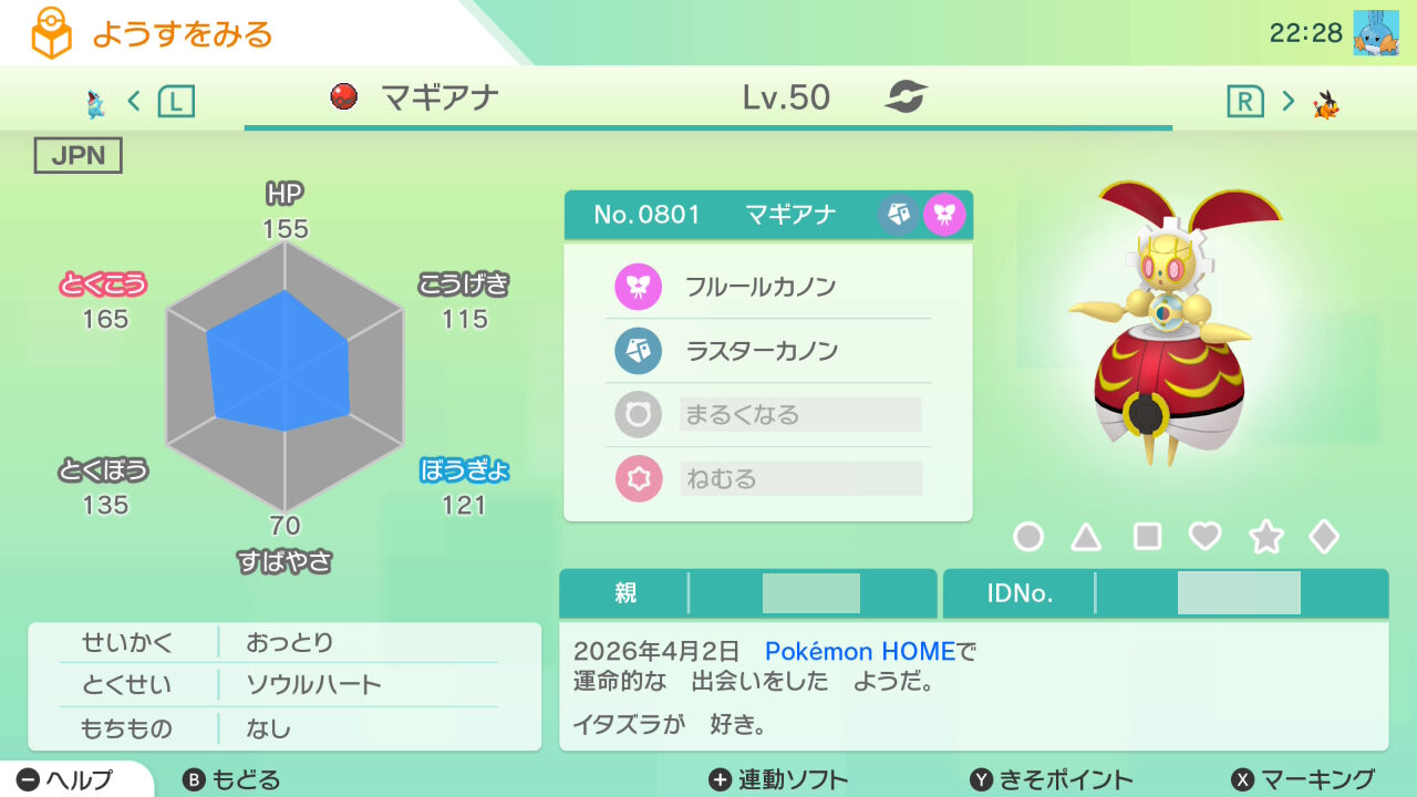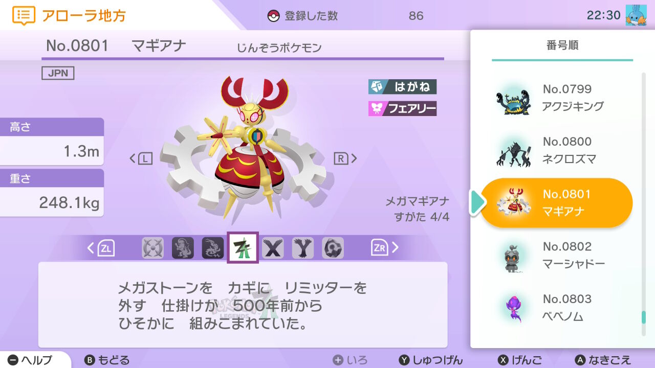 そんなわけで、念願の「マギアナ(500年前の色)」をゲット!正確にはNo.001(フシギダネ)~No.890(ムゲンダイナ)までの幻のポケモンを含むすべてのポケモンをHOMEに登録することで手に入る。ポケモンから離れていた時期がその範囲内だったから、いつか再度幻のポケモンたちが手に入る機会があることを願っていたらまさか1本でまとめて手に入るとは。