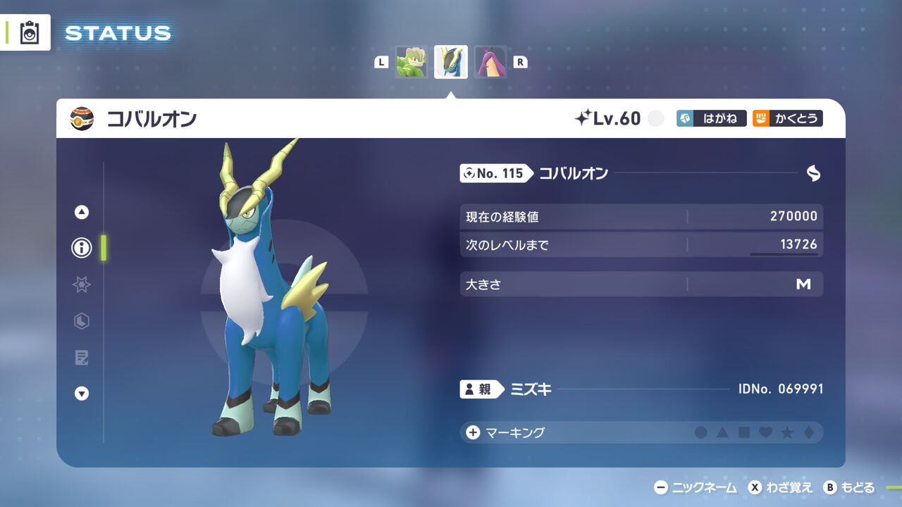というわけで「コバルオン」の色違いをゲット!通常より濃い青色になっている。他2体と比べると大きく変化はないが、濃いのはそれはそれで似合っている。