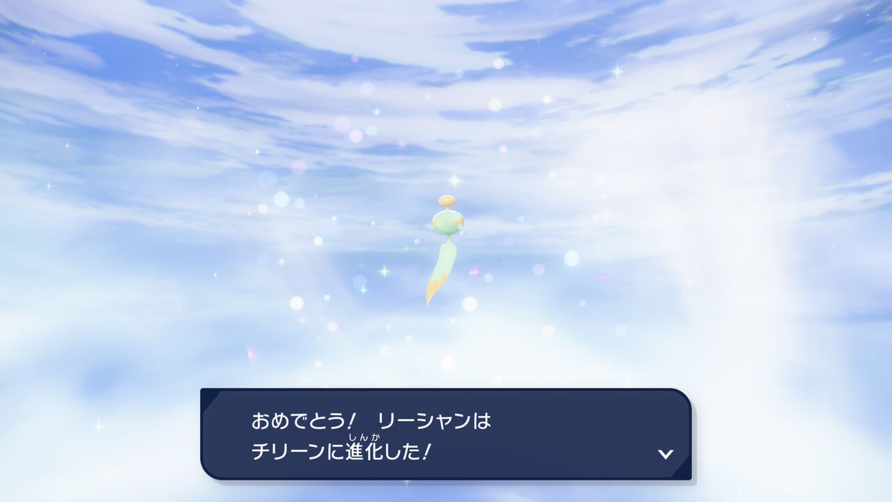続いて「チリーン」。色違いは薄っすら緑っぽくなり、メガシンカもそのままの感じ。くっついてる分身(?)も同じ色になっている。