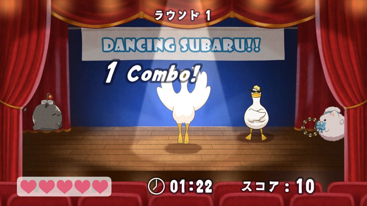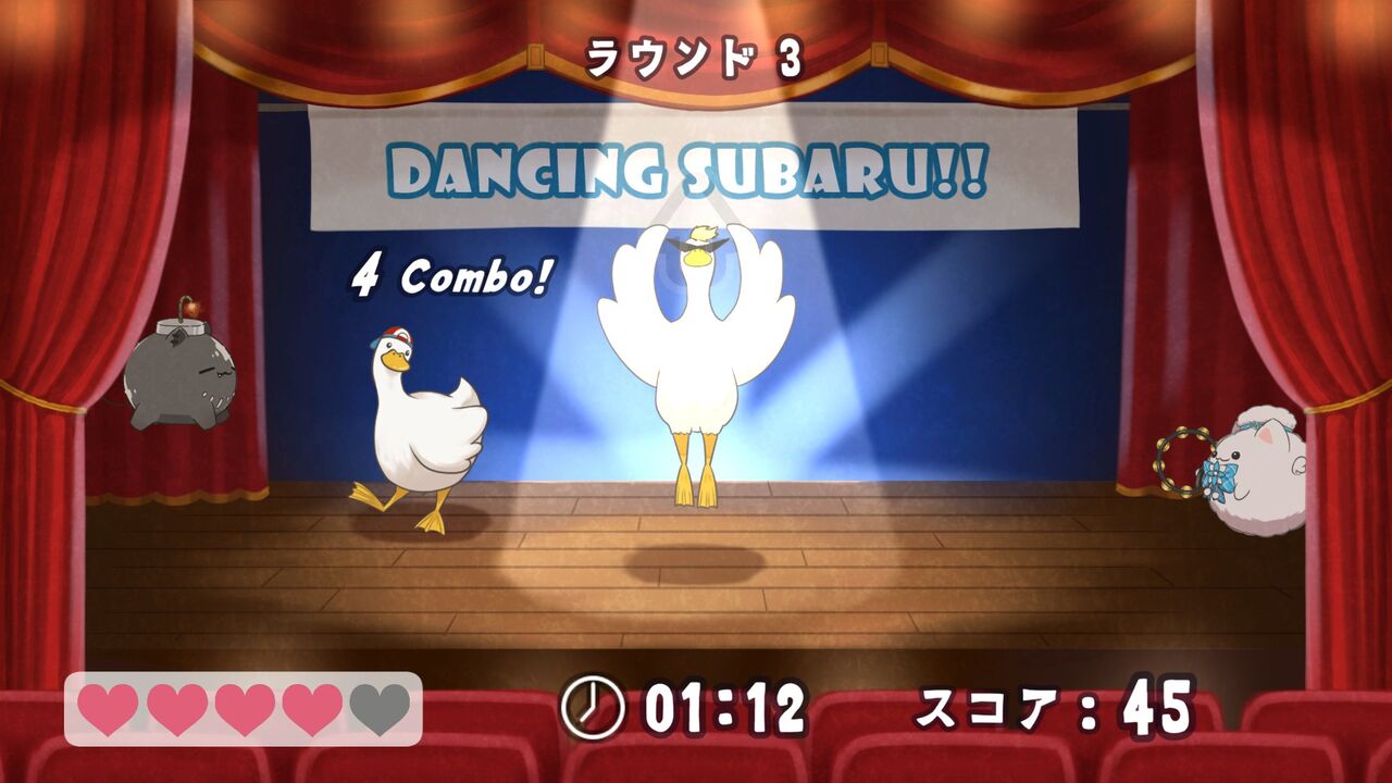 もうひとつは「ダンシングスバル」。ライバルアヒルのダンスを真似して、上下左右にタイミングよく動くという記憶ゲーム。ダンスなのでリズムに合わせて動くタイミングも真似する必要がある。ポケモンDPtのコンテストを思い出した。