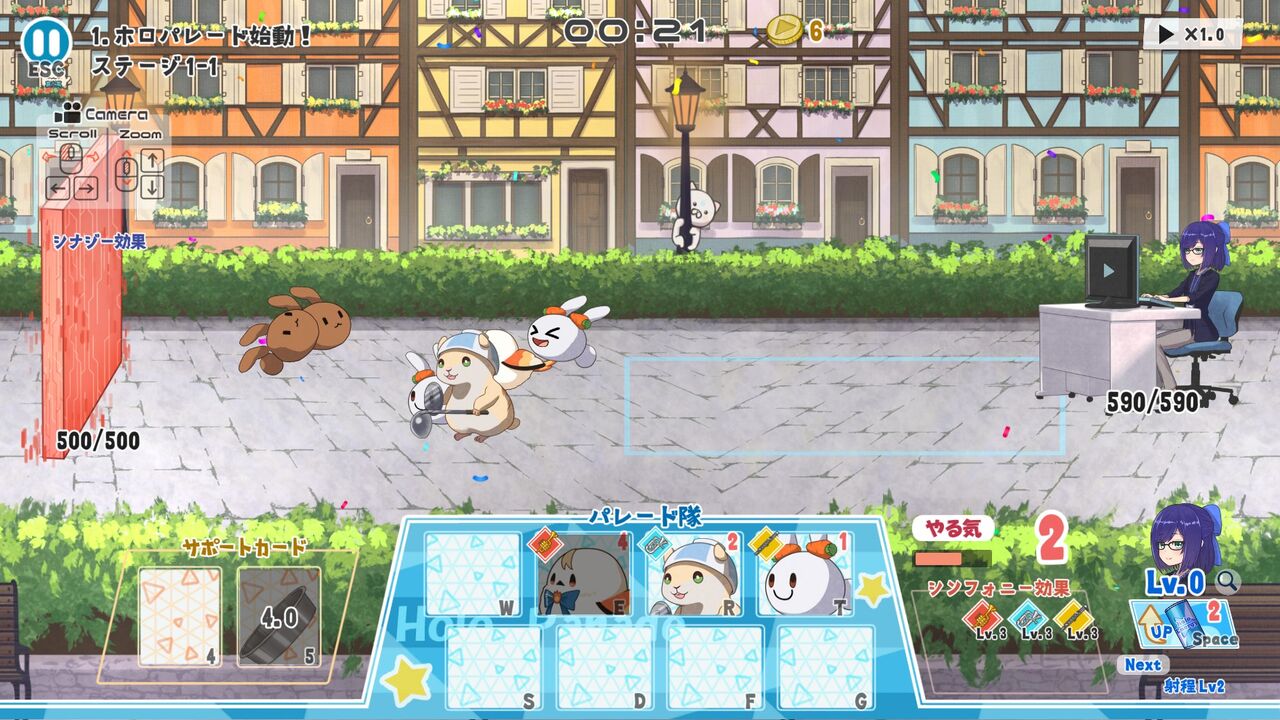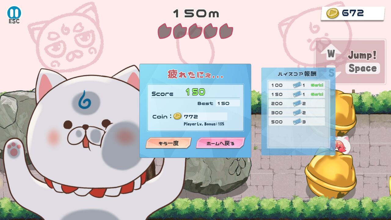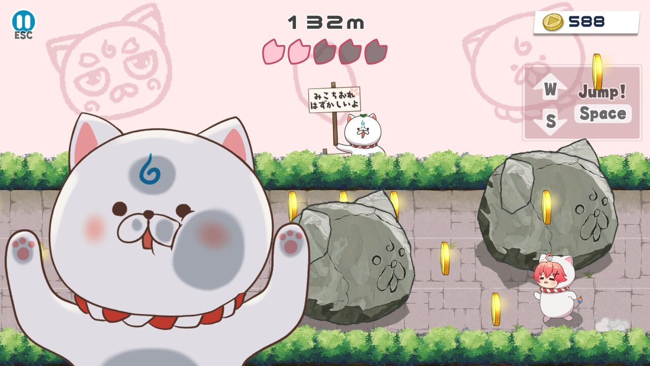 まずは「いそげ!みこち!」。ベルトスクロールアクションで、自動で左に進んでいくので障害物を避けながらコインを集めていく。上中下の3レーンあって、Wキーで上レーンへ、Sキーで下レーンへ行く…というか押してる間だけ上下移動して、なにも推してないと中央レーンに自動的に移動するっぽい。ジャンプはSpace。