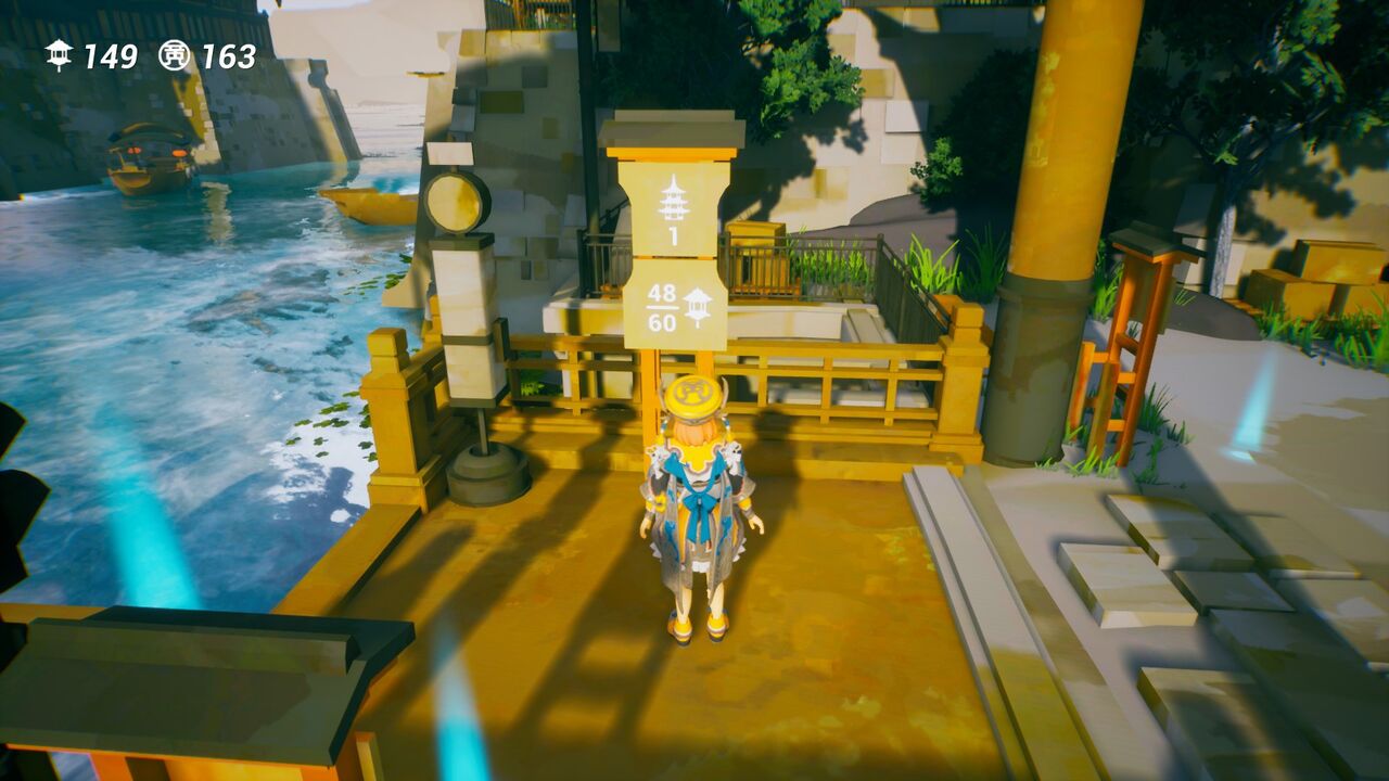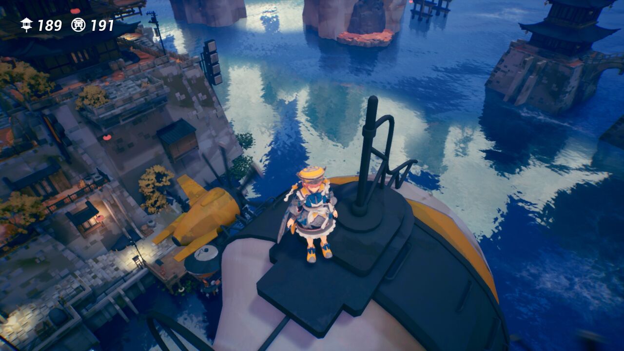 改めて潮風埠頭から探索し直し。前回は気付かなかったけど、街中の方にもチェックポイントを進んでいくやつが各エリア3つずつ追加されていた。水色の光が目印。特に制限時間などはないので、近くのコインを拾いながらでも。
