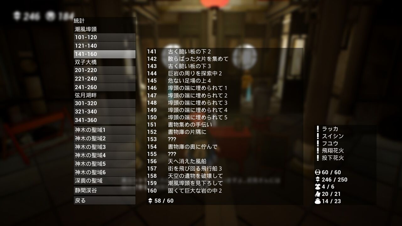 …のつもりだったんだけど、なんとメニューの「地図」「統計」で全部確認できることが判明。気付くのが遅すぎる(なお地図は各エリアの購買で購入しないと場所までは表示されない)。