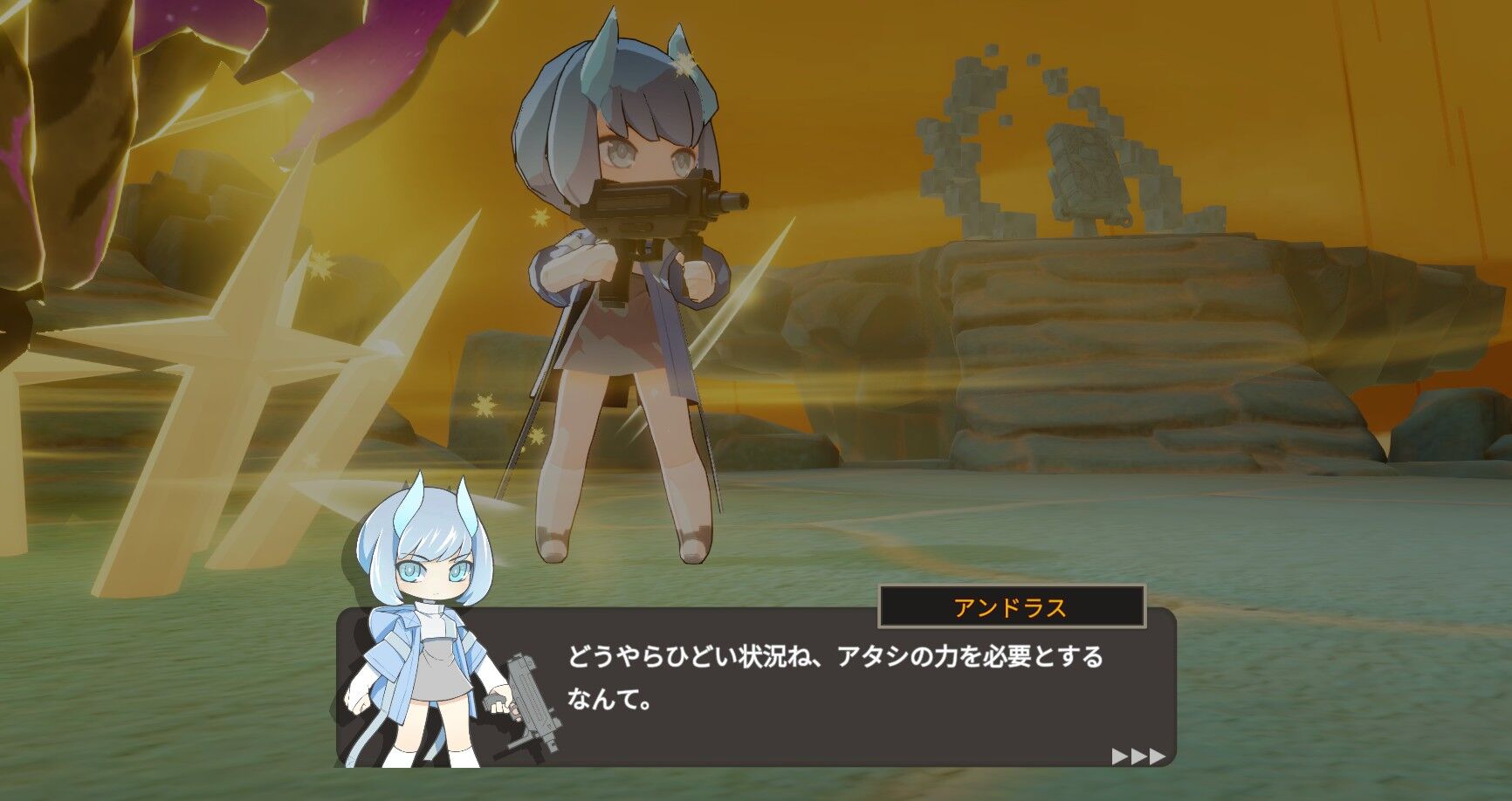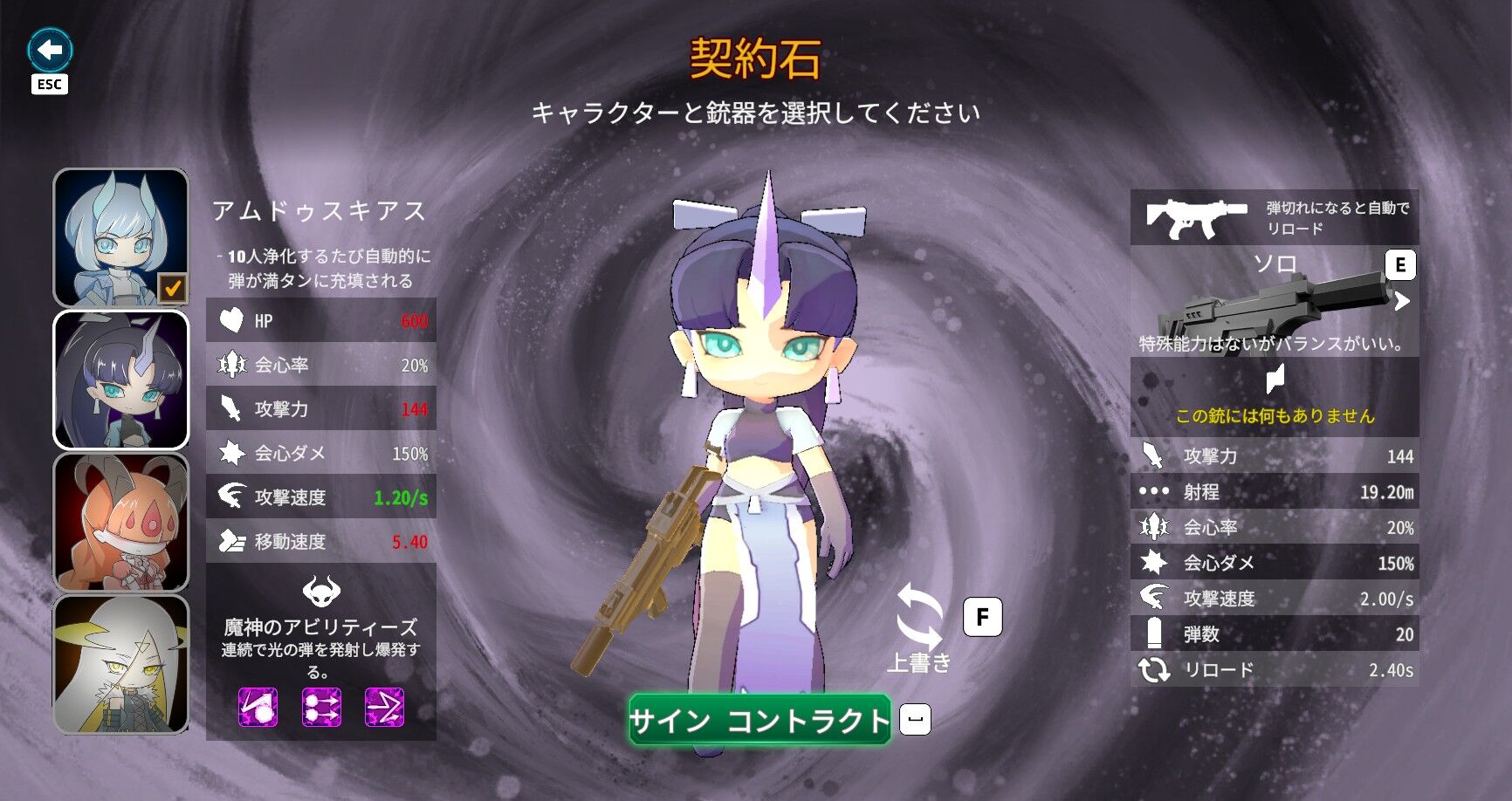 折角だから「ソールストーン」からキャラチェンジ。一本角の姉御みたいな見た目した「アムドゥスキアス」にしてみた。こちらはアンドラスと比べるとHPはやや低いが、銃撃の射程が長く弾数も多い。リロードは弾が尽きると自動的に行う。