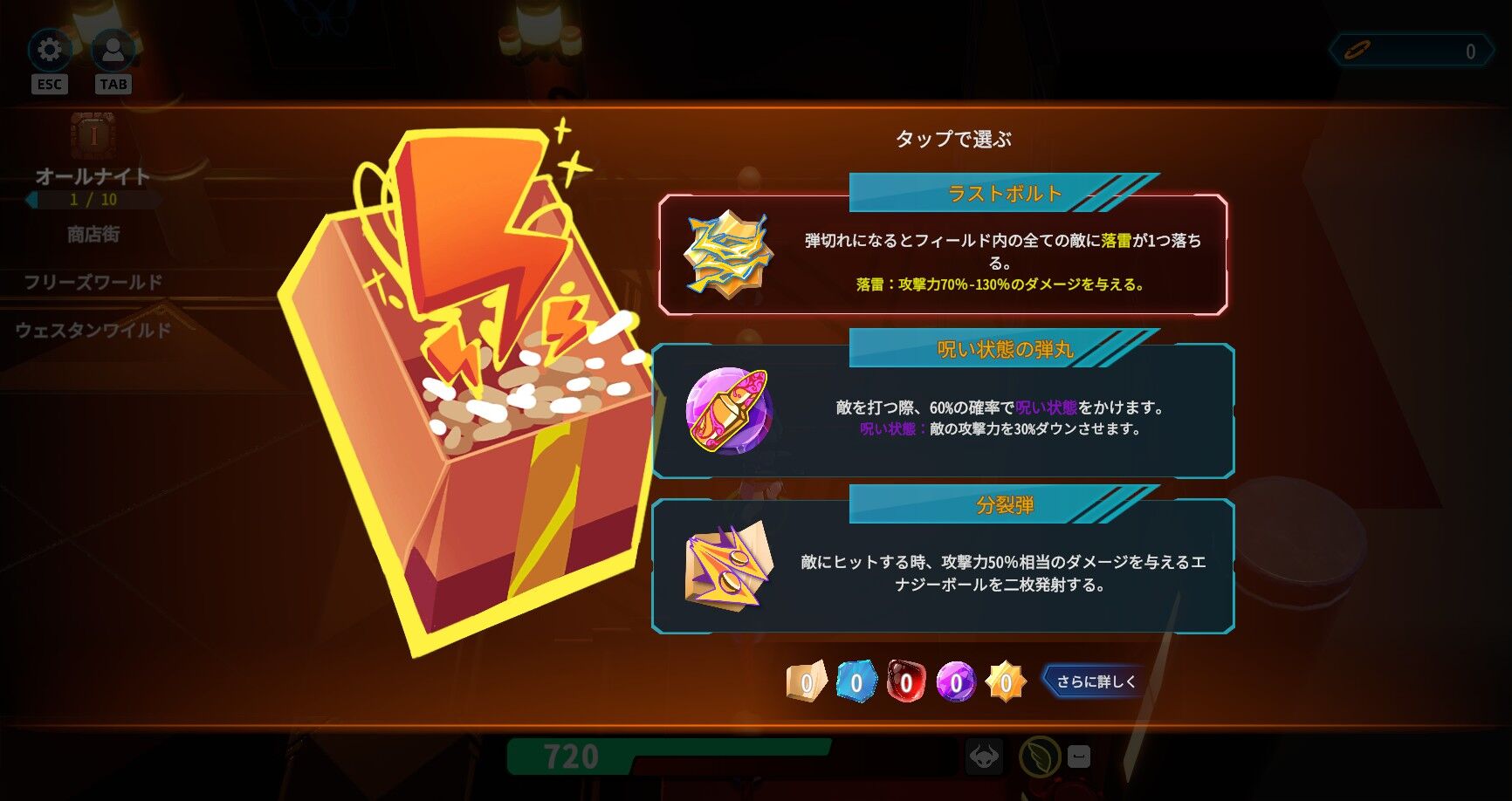 ステージクリア時の報酬は4タイプ。1つはスキル取得。ランダムで表示される3つのスキルから1つを獲得する。状態異常などの効果内容もしっかり併記してくれる親切設計。