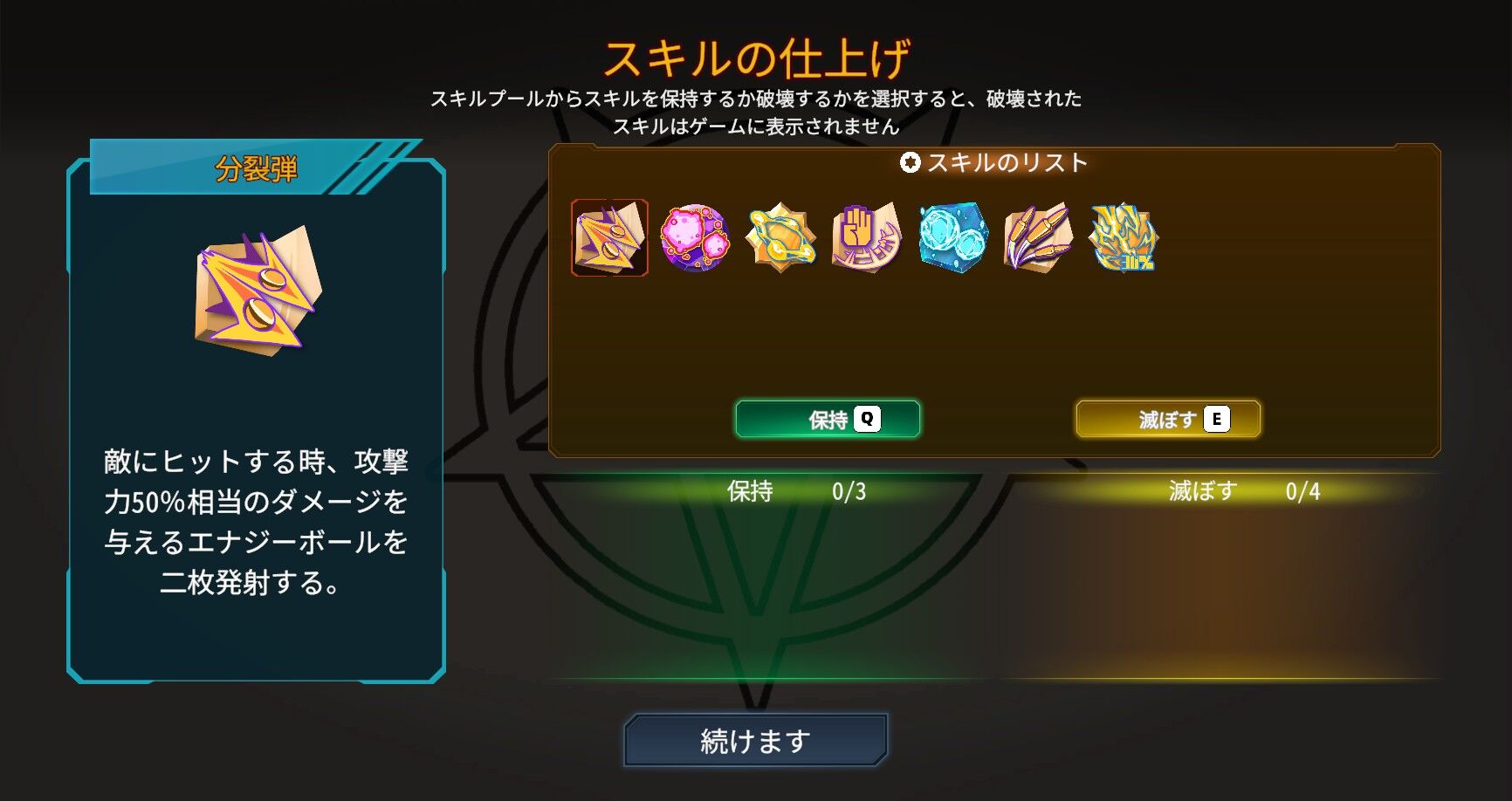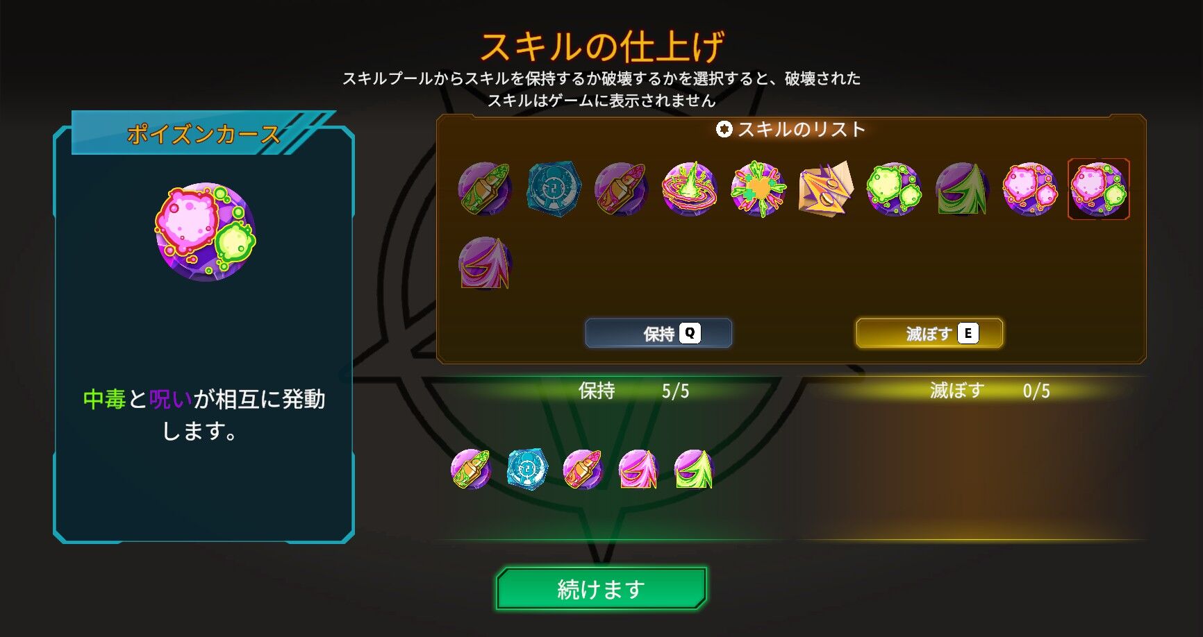 エリアをクリアすると、取得したスキルから一定数を保持できる。また取得してみたけど使えねーってスキルを「滅ぼす」ことで、今回のプレイ中は今後一切出現しなくなるということも出来るっぽい。