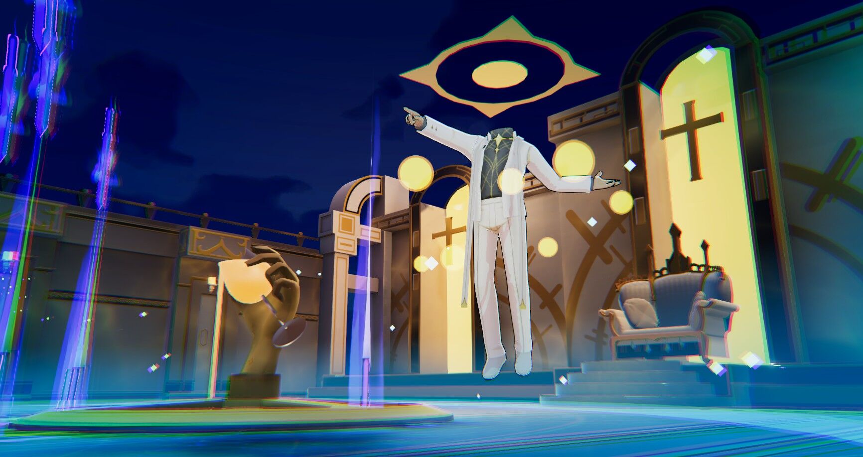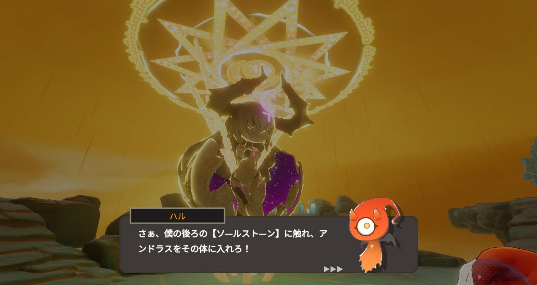 ゲームを始めるとオープニング。ざっくりまとめると「天界」「人間界」「魔界」とある世界で、天界の「聖霊」が人間たちをモンスターに変えて操り、魔界にも攻め込もうとしているから、人間たちを浄化して聖霊の侵攻を食い止める…みたいな。そこで魔界の案内人「ハル」は、人間からの供物である羊を「ソールストーン」なる像へ捧げ、魔神「アンドラス」を呼び出し聖霊との戦いへ赴いてもらう。ちなみに供物である羊は一瞬とはいえ操作可能。