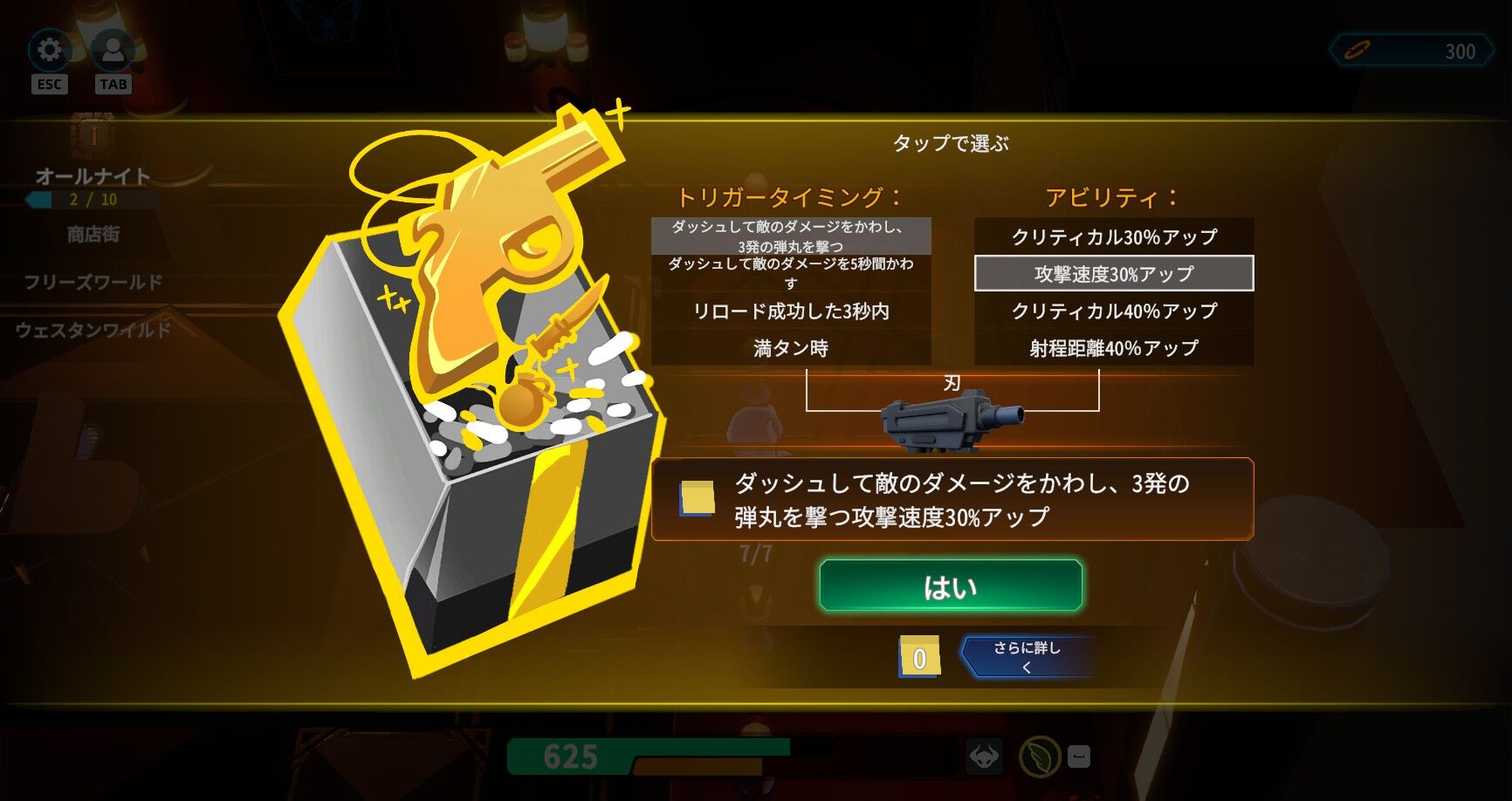 あとやや低いHPも、2秒間立ち止まることでシールドを展開するスキルを早々に引けたことで解決。まぁそれでもステージが入り組んでいたり狭かったりするところでちょっと危なかった面もあったが。