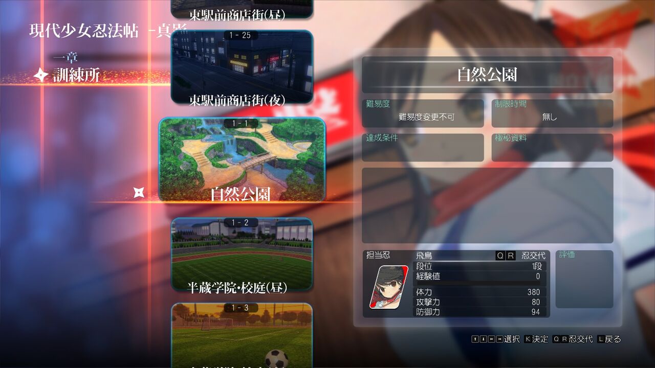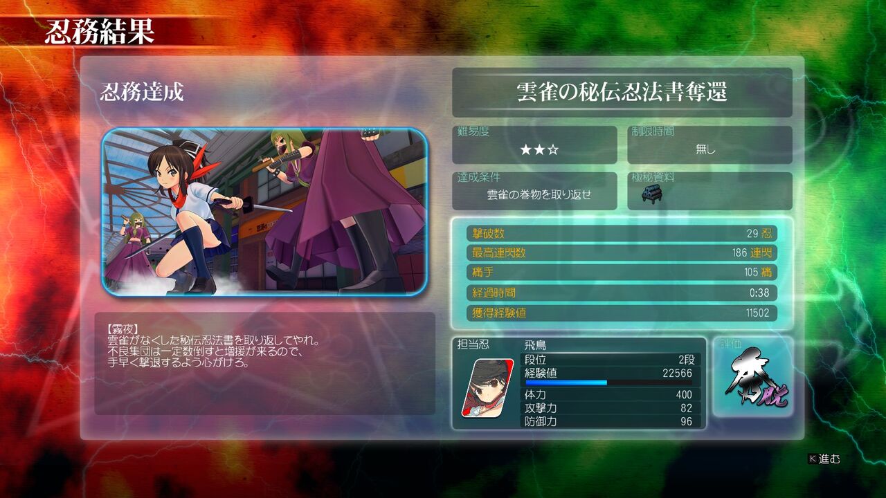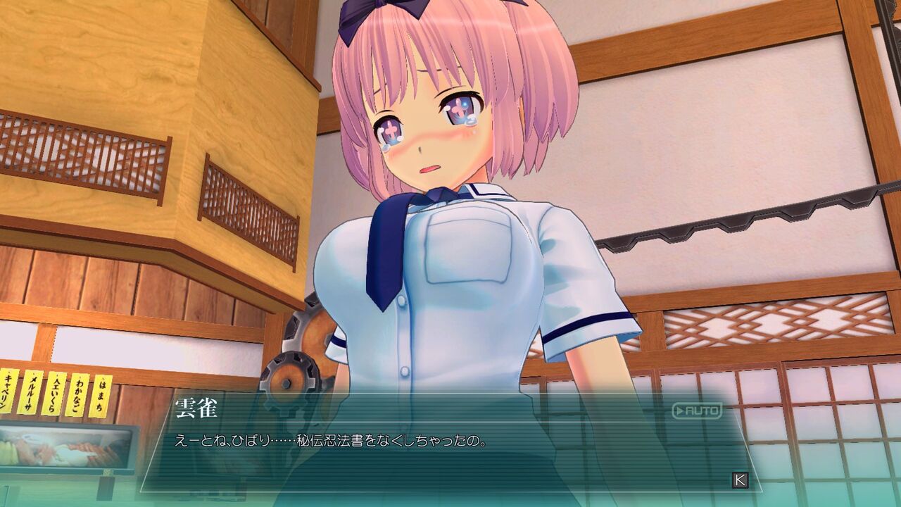 続いて1-2「雲雀の秘伝忍法書奪還」。画像(下)のピンク髪で特徴的な瞳をしている少女が「雲雀(ひばり)」。忍にとって重要な秘伝忍法書をどこかで落としてしまい、授業が始まる前に飛鳥が探しに行ってあげるという話。