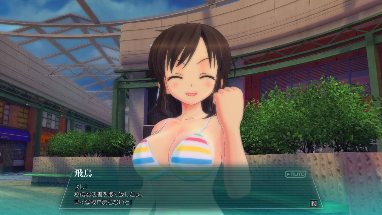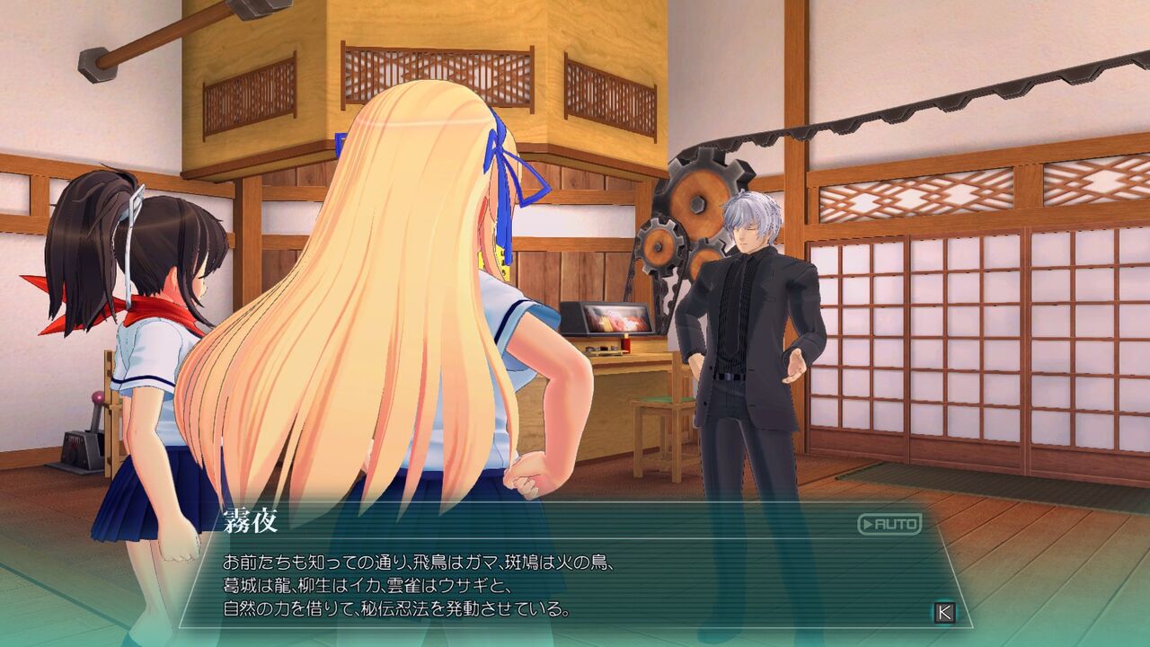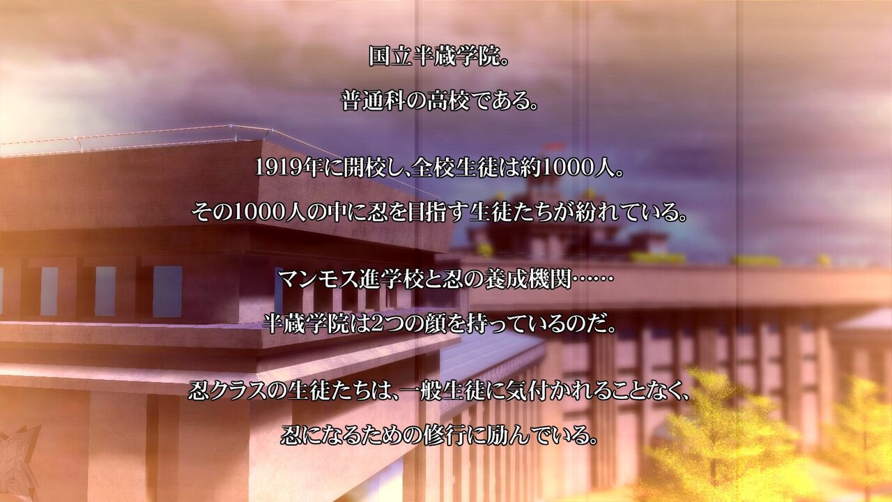 その後少々長い世界観説明。要するに現代にも「忍」はいるが、金持ちや政治家が利用する悪徳忍が横行しており、その対抗策として政府は善の忍を育てるため、普通の高校に紛れて忍の養成機関を設立し、そこに通う少女たちの物語…みたいな感じ。たぶん。