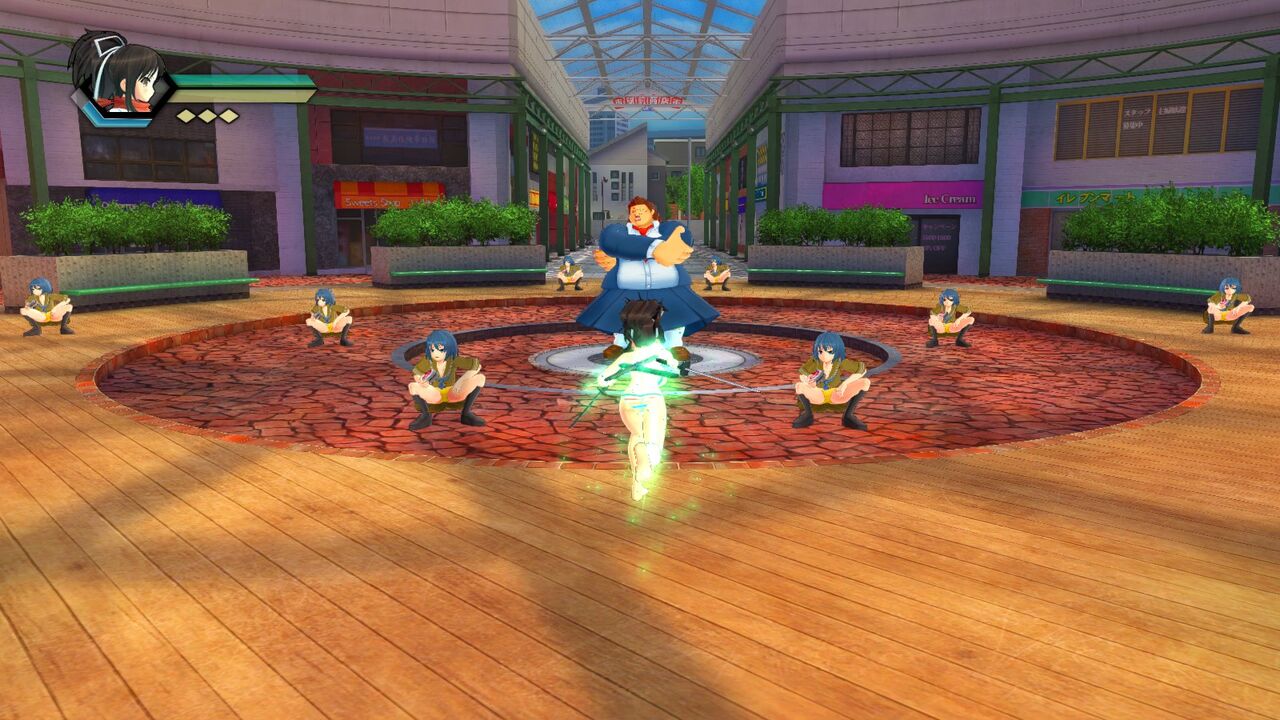 というわけで商店街にて下着姿の少女が、異様に巨体の女(?)と大量のヤンキー座りのせいでパンツ丸見えになっている女子高生集団を相手に乱舞するとかいう異様な光景の出来上がり。一応この手のではよくある一般人は入れない人避けみたいな力はあるようだが…