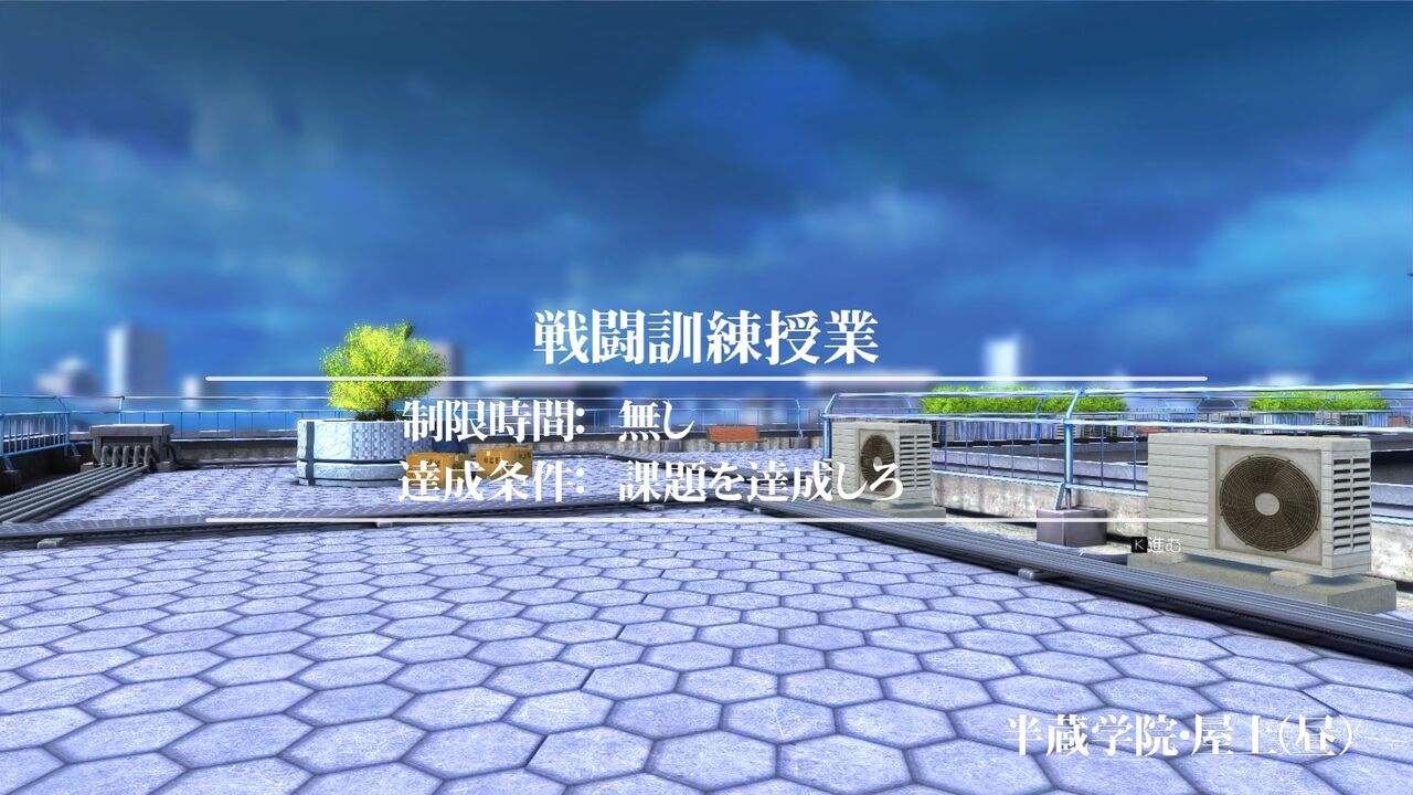 1-1「戦闘訓練授業」。先述したようにチュートリアルなのだけど、操作説明がコントローラー基準で書かれているせいでキーマウだと先にコンフィグ見ておかないとどれかわからないという。加えて初期設定だとWASDと左右クリック以外はちょっと一般的とは言い難い配置をしているので、やりやすいように設定変えておくのを個人的には推奨する。